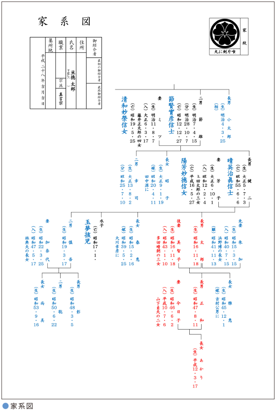戸籍謄本・除籍謄本類を取り寄せ、お墓・仏壇・過去帳・位牌などの調査をして、完成させます。