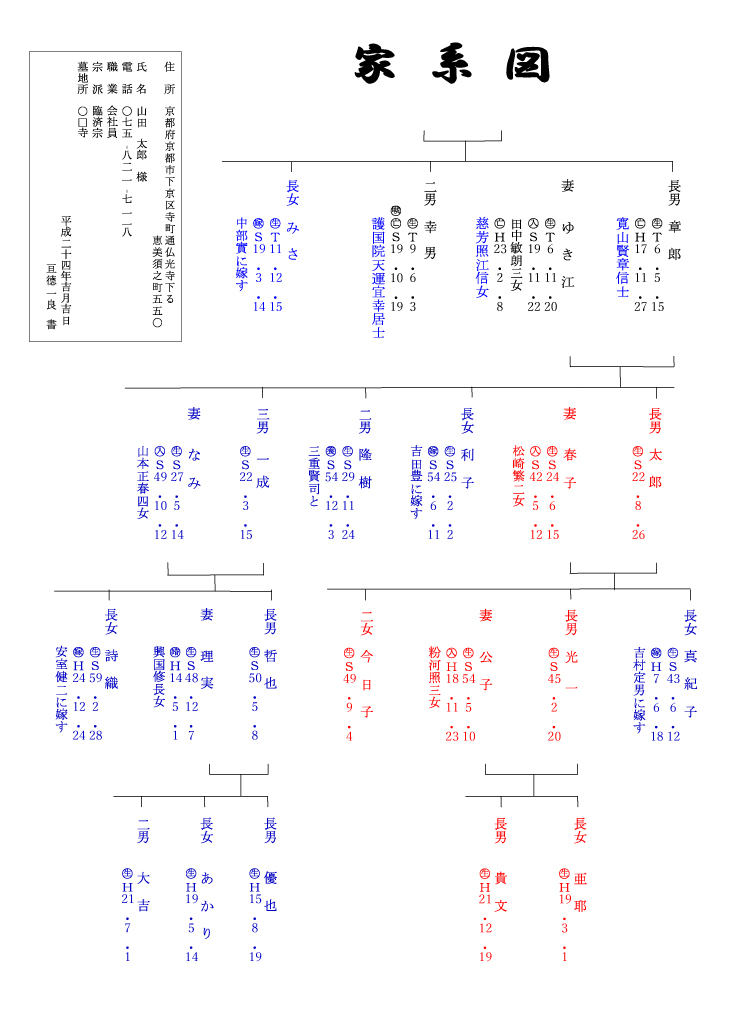家系図にはその家その家の歴史があります。名前も顔も知らない先祖ですが、生きて恋して笑って泣いてその時代を精一杯行き抜き、そして現在のあなたに繋がっているのです。百年前にあなたそっくりな先祖がいたかも知れません。そのような思いで家系図を見るとご先祖お一人お一人の生き様も見えてきそうです。